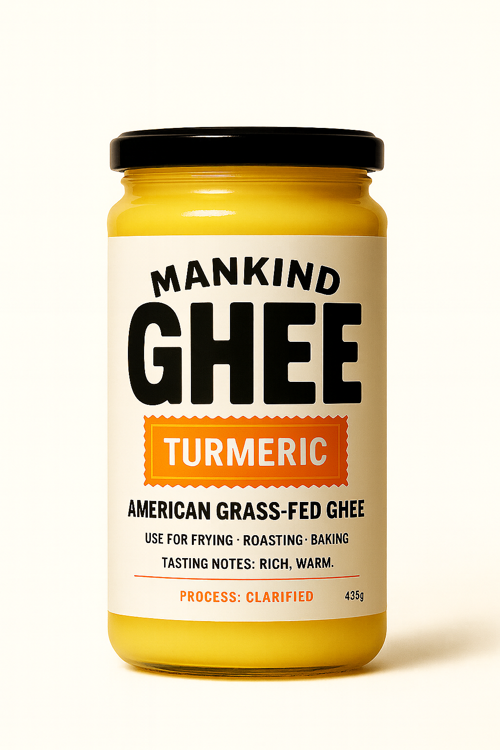 Mankind Turmeric Ghee is handmade in small batches from American grass-fed butter, slowly clarified and infused with golden turmeric root. Earthy, warm, and aromatic, this ghee brings natural depth and vibrant color to your cooking. With a high smoke point (485°F), it’s perfect for sautéing, roasting, baking, or stirring into warm drinks. Naturally lactose-free, keto-friendly, and shelf-stable, this ghee combines flavor with the timeless goodness of turmeric.